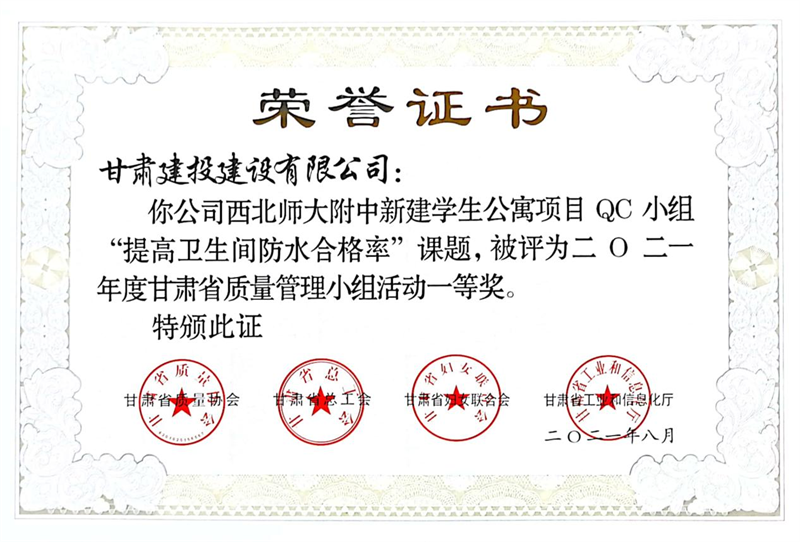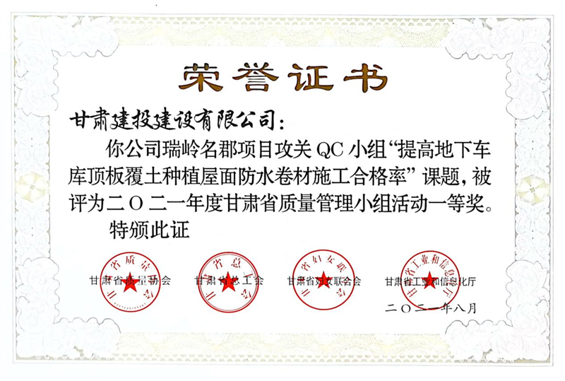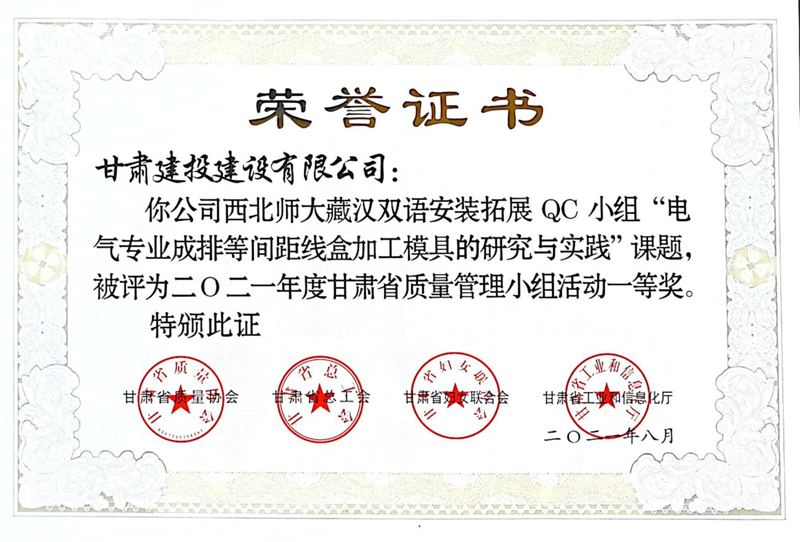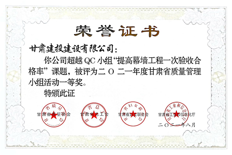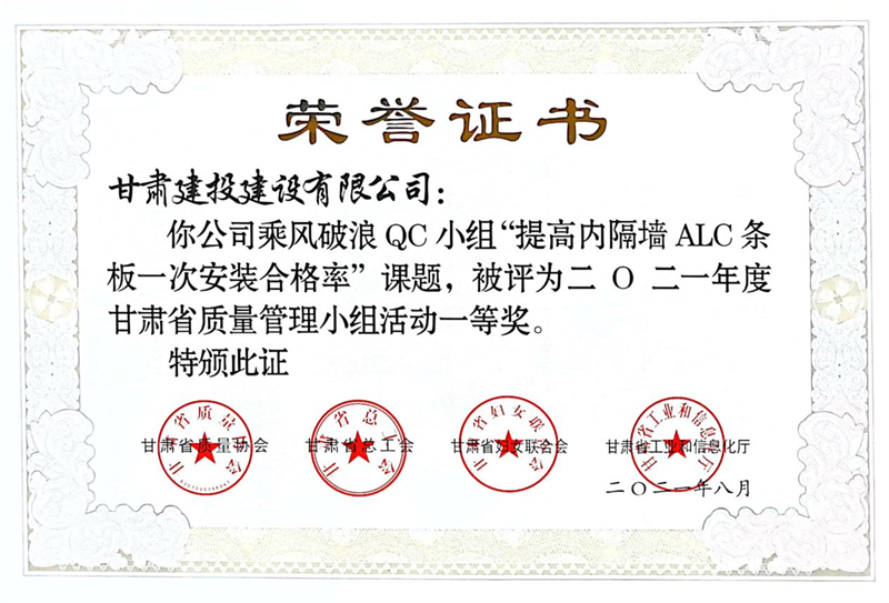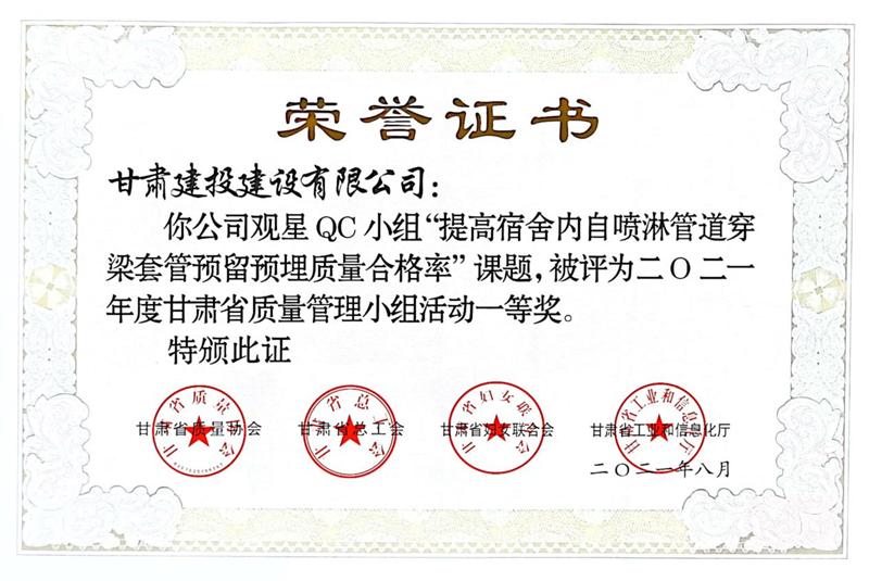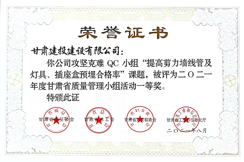 建設(shè)公司申報(bào)的36項(xiàng)QC成果中,1項(xiàng)成果獲全國(guó)“工程建設(shè)質(zhì)量管理小組二類(lèi)成果,1項(xiàng)成果獲“甘肅省質(zhì)量管理小組活動(dòng)最高榮譽(yù)獎(jiǎng)——特等獎(jiǎng)”、14項(xiàng)成果獲一等獎(jiǎng)、19項(xiàng)成果獲得二等獎(jiǎng)、2項(xiàng)成果獲得三等獎(jiǎng)。建設(shè)公司榮獲“2021年度甘肅省質(zhì)量管理小組活動(dòng)優(yōu)秀企業(yè)”稱(chēng)號(hào),這是繼2019年后,公司連續(xù)三年獲此殊榮。