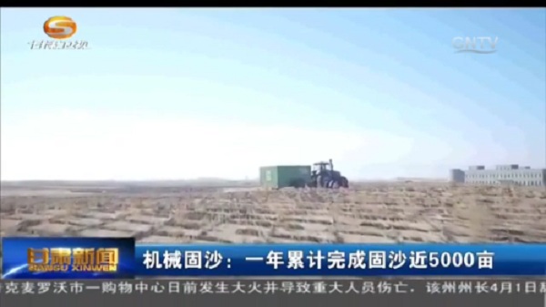 在甘肅武威,眼下,正是固沙治沙的黃金時期,機械固沙車正在涼州區北部九墩灘、騰格里沙漠南部邊緣開展壓沙作業。機械設備利用稻草、麥秸等植物莖桿,在沙漠表面鋪設草沙障,增加了沙漠表面的粗糙度,消減風力,阻止流沙移動,截流雨水。其鋪設效率約為5畝每小時,插草深度約15厘米,高度約30厘米,和人工治沙相比,效率提高近50倍。
